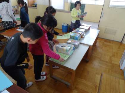 新しい教科書を受け取りました。子どもたちは笑顔で目を通していました。