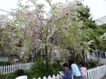 観察池横の板橋桜を観察している様子です。