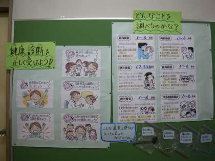 保健室前の掲示板です。健康診断を正しく受けられるように見ておきましょう。