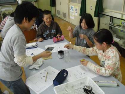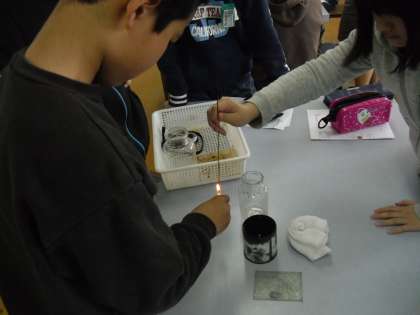 透明のビンの中にろうそくを入れてふたをすると,ほのおはどうなるのか調べています。