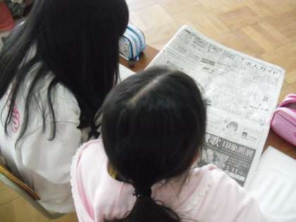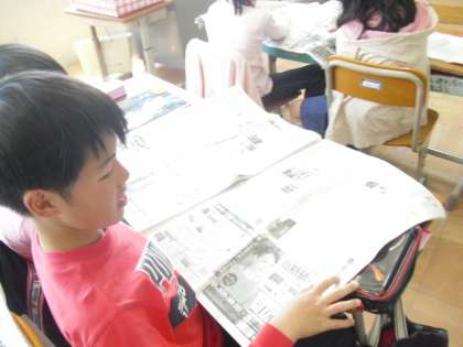 今日の学習は「新聞を読もう」です。多くの子は,普段テレビ欄しか見ていなかったようですが,よく見てみると新聞にはいろいろなことが載っていることに気付きました!「料理の作り方も載ってる!」「生まれたばかりの赤ちゃんのことが載ってる!」「全てのページに日付が書いてある!」「新聞にもページ番号があるんだ!」など,新聞についてたくさん発見した時間になりました。