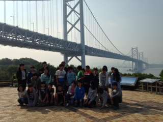 瀬戸大橋を渡っています。与島パーキングエリアでは,クラス写真を撮りました。