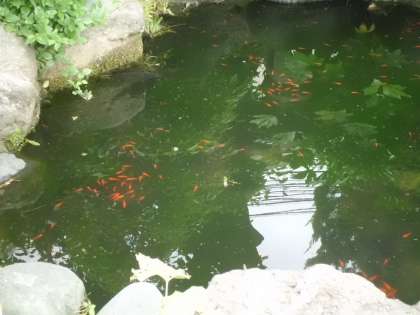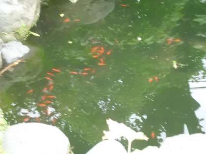 学校の池にたくさんの金魚が泳いでいます。お祭りの金魚です。