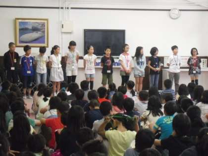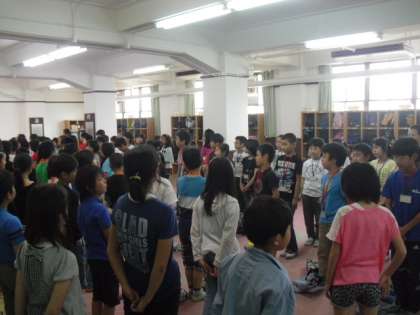 今日1日一緒に活動する小学校のみんなと挨拶をした後,第1回目の全体ミーティングを行いました。各ブースの代表者からの挨拶がありました。