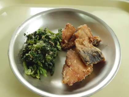 鯵の琥珀揚げ 大根葉のごま炒め