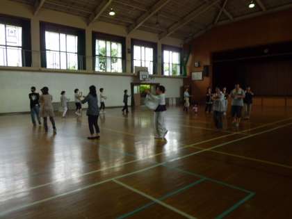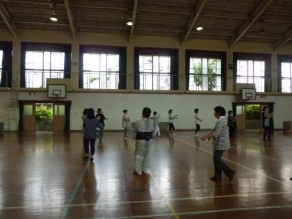 蒸し暑い中,女性会の方々に上手に踊るコツを教えていただきました。