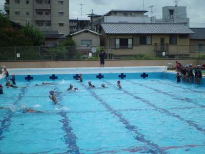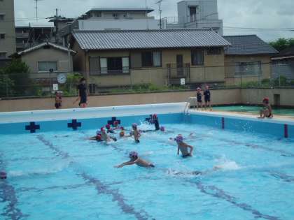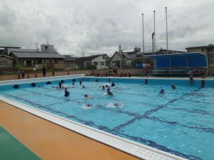 今にも雨が降り出しそうな空模様ですが,参加している児童は元気にみずあそびを楽しんでいます。