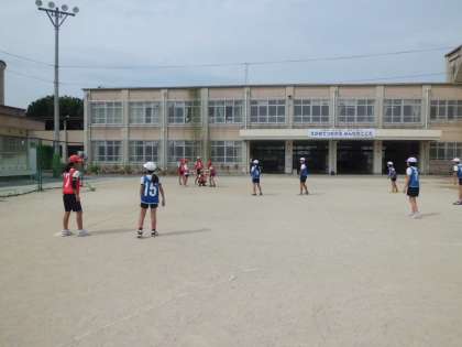 5年生は今,大きく柔らかいボールを使って「ハンドベースボール」を楽しんでいます。