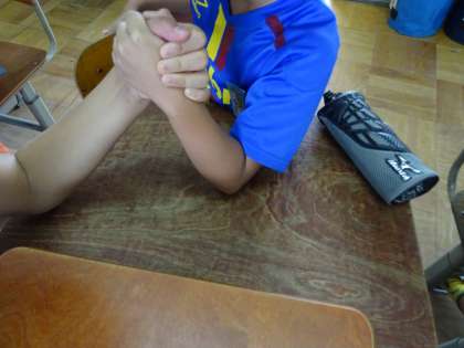 腕相撲をして,腕を曲げたり伸ばしたりしているときにつかっている体のつくりについて調べ,話し合いました。