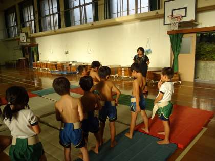 第9回御香宮ちびっ子相撲大会に向けての最後の稽古をしました。中学生のお兄さんやお姉さんが応援に駆けつけてくれ,優しく教えてくれました。