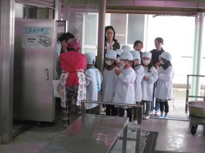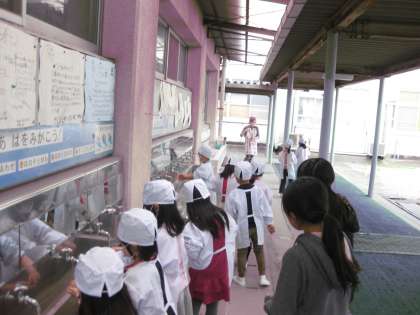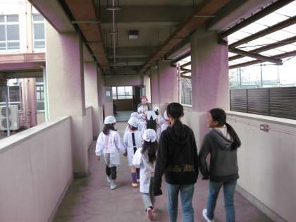 さていよいよ、給食室にとりに行きます。全てが初めてのことですが、6年生がついてきてくれるので安心です。