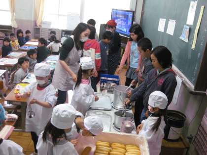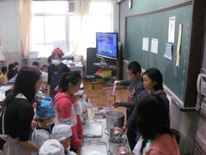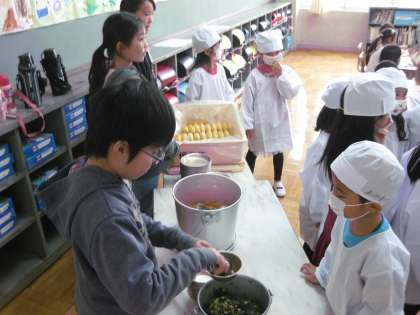 配膳も6年生が手伝ってくれます。たよりになる6年生です。6年生も、今日はいつもより顔つきが優しく見えます。