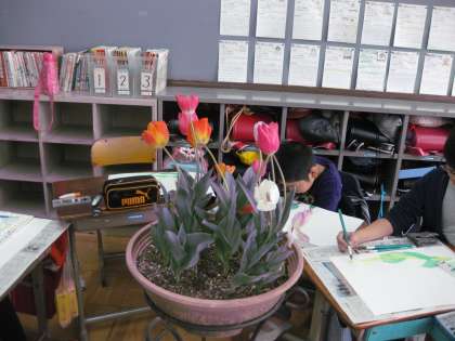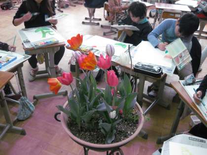 春の青空の下で、チューリップを描きたいのですが、今日も雨でした。そこで、教室に鉢植えのチューリップを持ってきて描いてみました。外で描くより集中して描くことができたようです。