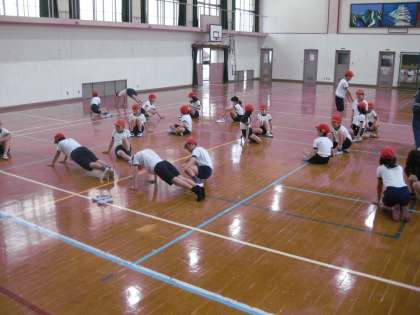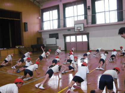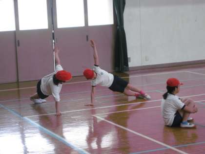 体育館で6年生が体育をしていました。少し早いようですが、6月にある運動会に向けて組体操の基本の一人技を練習しているようです。