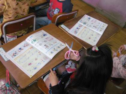 こちらの教室では、はさみの使い方の学習をしています。