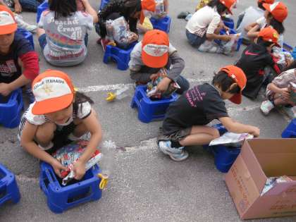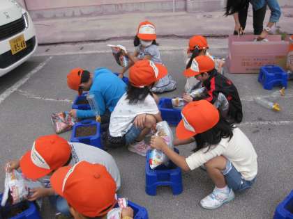 運動会の練習をしている,その横で2年生が個人の小さなプランターに土を入れていました。それぞれが,思い思いの野菜を植えるようです。ミニトマトがたくさん実ったら1つくれるそうです。たくさん実ってほしいですね。