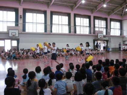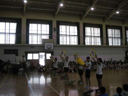 エールを送ったり,6年生は,一輪車をのって,また,フラフープを回しながらメッセージを伝えました。