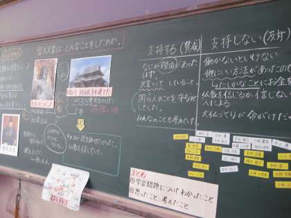 しっかりと練られた発問に,子どもたちもよく考えて答えています。友達の意見をよく聞いて,意見をつなげることができました。また,資料をちゃんと見て,自分の考えを理由をつけていうこともできました。とってもよく考えて授業を受けられる6年3組です。