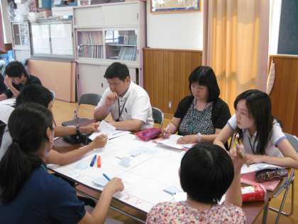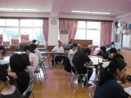 授業が終わった後は,ふれあいサロンで授業を振り返って先生同士の話し合いがもたれました。実際の授業を見て,成果と課題を出し合い,今後の自分たちの授業に活かそうと熱心な議論が交わされました。