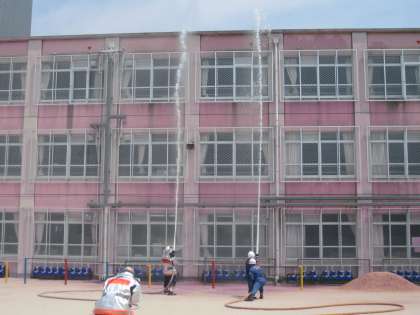 最後に,伏見消防署の方と板橋消防分団の方々の放水訓練を見せていただきました。きびきびと行動されていて,とても勇ましかったです。