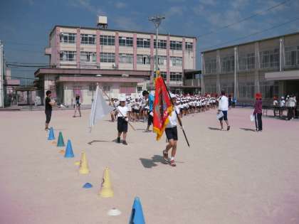 いよいよ本格的な入場行進です。優勝旗や,紅白の大旗・プラカードを持つ6年生の行進は見事です。ひざもよく上がっていて,見ていて気持ちがいいです。