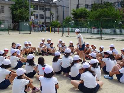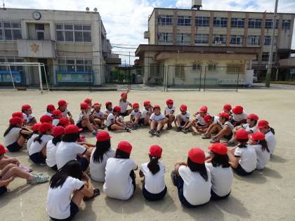 運動場に出ての練習です。体育館とは違い,滑りやすく少し戸惑い気味の子どももいました。