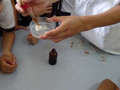 種子に含まれている養分を, ヨウ素液などを適切に使って観察しました。