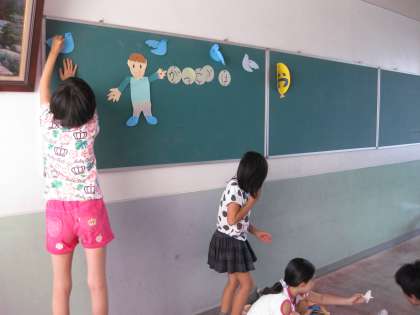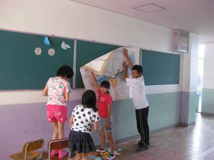 掲示委員会は,みんなに楽しんでもらえるような工夫した掲示物をつくって,掲示板に貼っていました。高いところに貼らなくてはならないので大変です。