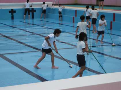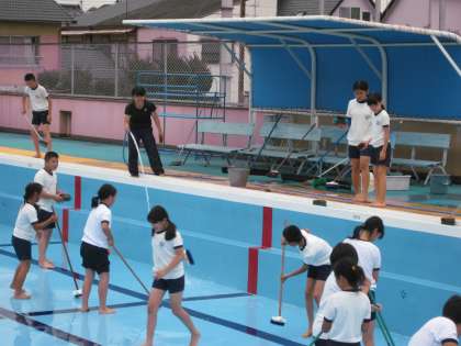昨日は,曇り空の中,教職員がプール掃除をする前に,6年生がプールをあらかた綺麗にしてくれました。楽しく笑顔いっぱいで掃除をしてくれました。