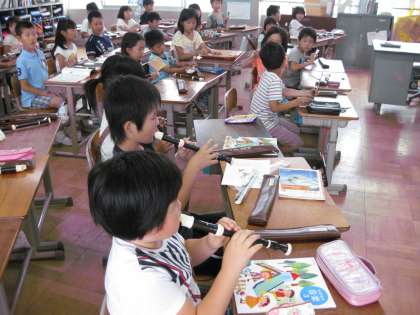 3年生がリコーダーの練習をしていました。「ソ」の音を舌を上手に使って音を切りながら曲にあわせて吹いています。