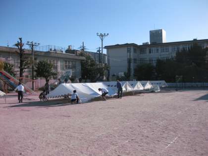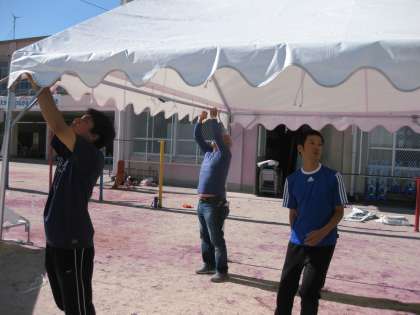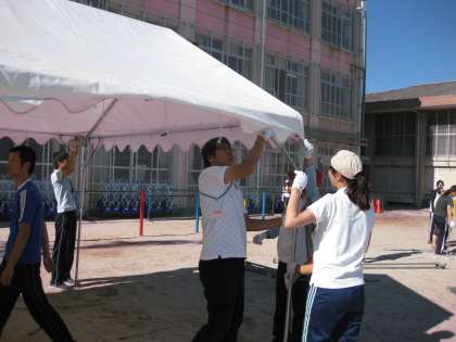 さて土曜日は,降水確率50パーセントと非常に難しい天気予報です。しかし,今日,テントを準備しました。テント張りには,体振と消防分団の方々にお手伝いをいただきました。ありがとうございました。