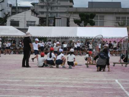 2年生の障害物競走は,くぐったりボールをゴールに入れたりで大変でした。本番はやっぱり焦るのか,ゴールにボールがなかなか入らない子もいました。でも,最後までちゃんとルールを守り切って,全員がゴールをしました。