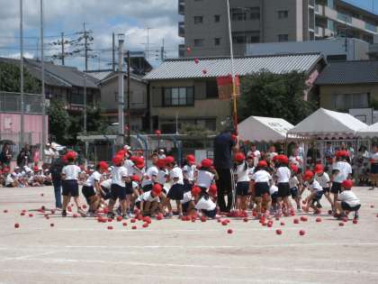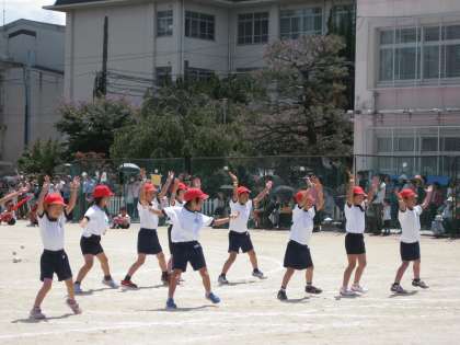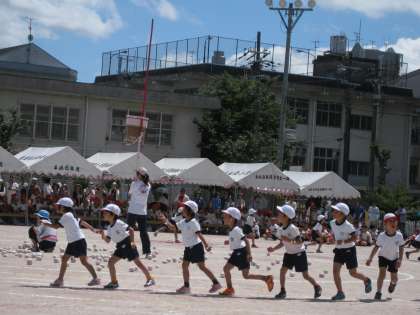1年生の玉入れです。玉入れをする前にダンスの披露です。2ヶ月前に入学してきたばかりとは思えません。楽しくしっかりと踊ることができましたね。