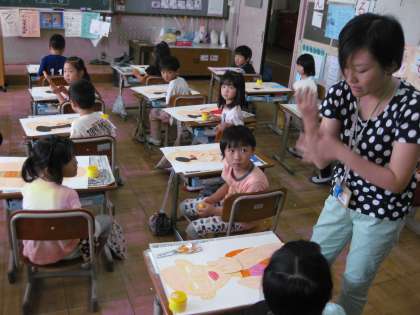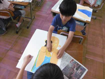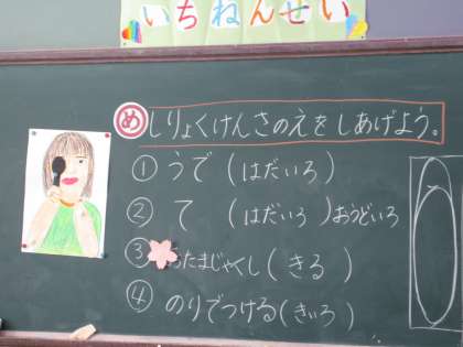視力検査・・・といっても保健室で視力検査をしているわけではありません。視力検査の様子を,絵に表そうとしています。1年生らしいダイナミックな絵です。腕は,他の紙に書いたものを,構図を考えて貼り付けるようです。できあがりが楽しみです。