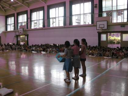 最後に,各委員会からのお知らせがありました。学校生活が楽しくなるような企画のお知らせや,様々な紹介,そして,みんなが気持ちよく学校生活が送れるように注意してほしいことなどが報告されました。インコの名前募集もありました。ふるって応募してくれたらなあと思います。