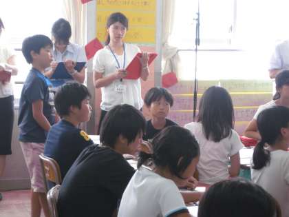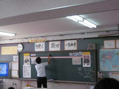 他校から来られた先生方は,授業をみながら熱心にメモをとっておられました。今日の学習問題は「どうして武士たちは,清盛(平氏)ではなく,頼朝(源氏)を支持したのだろう」です。挙兵して敗戦後の頼朝家来は6人でした。しかし,壇ノ浦の戦いの時には,2万5000人で,平氏を10000万人も上回っている事実から,疑問をもち調べ学習を始めました。さて,問いに対する答えは導き出されたのでしょうか?