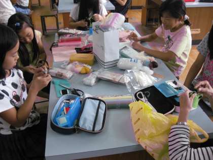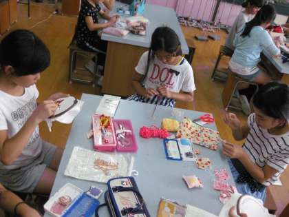 手芸クラブです。刺しゅうをしているグループやマスコットを熱心に制作中のグループあります。できあがりが楽しみですね。