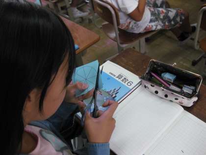6年生の教室では,画用紙に書いた円を切って,またそれを扇形に切っていました。扇形をドンドン細かくしていって面積を求めるようです。