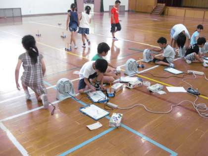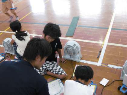 先日,ゴムの力を調べていた3年生ですが,今日は,小さな扇風機を用意して,風の力を調べていました。風が強いほど・・・で,風が弱いと・・・でしたね。