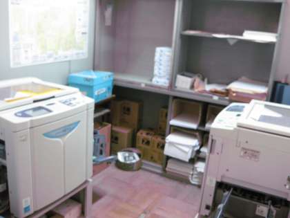 畳4畳分ぐらいの狭い部屋です。学校の規模に比べるとやや小さい印刷室です。ここで,子どもたちに渡すプリント類を刷っています。