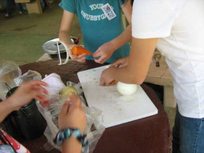 昼食のカレー作りでは、役割を分担しグループのみんなと協力しながら進めていました。先日家庭科でも包丁の使い方を学習したので、みんな上手に野菜を切っていました。