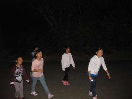 本日最後のメニューは、ナイトハイクです。夜道を歩きながら、夜に聞こえてくる虫の音色や、闇夜でも目が慣れてくるといろんなものが見えるはずです。が・・・