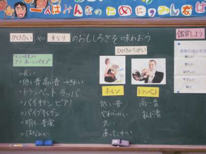 音楽の時間です。音の「かけあい」と「かさなり」についてCDを聴いて体感していました。 ホルンとトランペットの音色が綺麗に重なります。みんな静かに聴き入っていました。