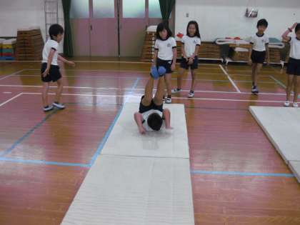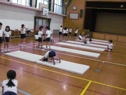 今日は3年生がマット運動に取り組んでいました。背中をまるくして後転に挑戦している子が多かったようです。