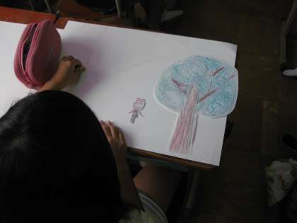 3年生もお話の絵に取り組んでいます。3年生は,大きな木の出てくるお話のようです。大きな木を別の画用紙に描いて,それを切り抜き貼っていくようです。2・30年前は,描いている絵に,他で描いた絵を貼るという発想はなかったですね・・・。