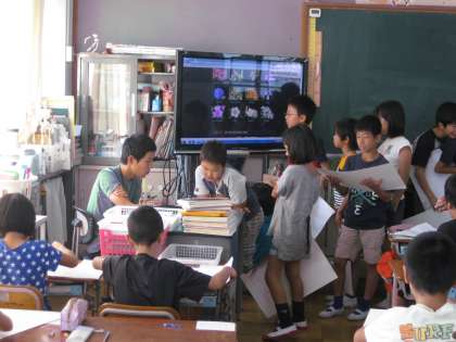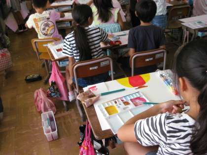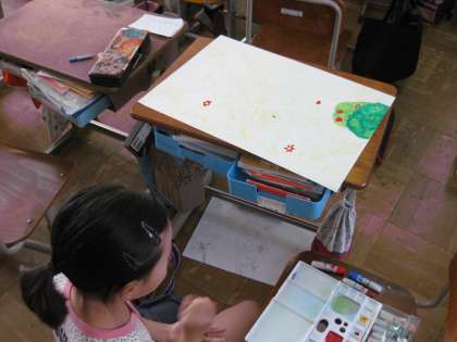 4年生もお話の絵を描いている真っ最中でした。4年生は,先生にアドバイスをもらっていました。一人一人丁寧に先生がアドバイスをしておられました。アドバイスを受けた子どもたちは,ニッコリとしながら自分の席に戻って,絵の続きを描いていました。
