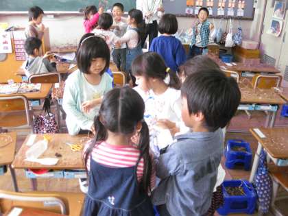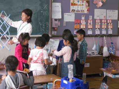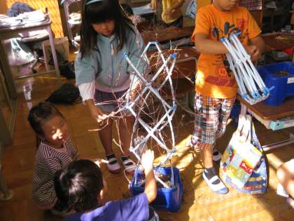 育てていたアサガオが枯れてしまったので,種を取った後,支柱から慎重にツルを外していました。このツルを使って,これからすてきな物を作るようです。出来上がりが楽しみですね。