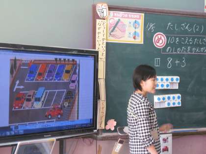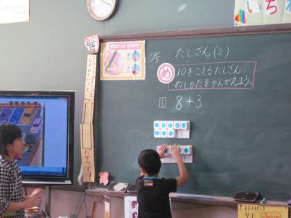 1年生の算数の時間です。今日は,8+3の繰り上がりのあるたし算を学習しています。数字ブロックを使って,10の枠に8を並べているところでした。並べ方にもいろんな並べ方があるのですが,まずは約束通りの並べ方をしてから計算です。基礎は大切ですね。