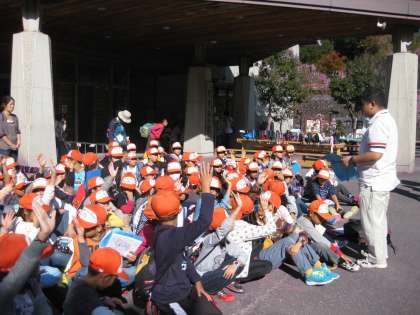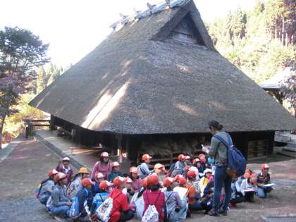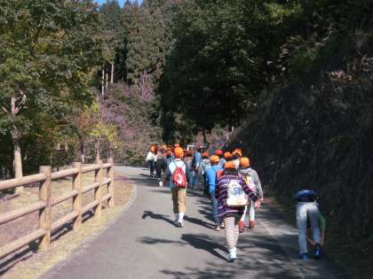 スコアOLが始まります。まず、全体説明です。その後、2か所からスタートをします。自然がいっぱいの山の家のコースをグループごとに問題を解きながらポイントを回ります。力を合わせて頑張ってください。