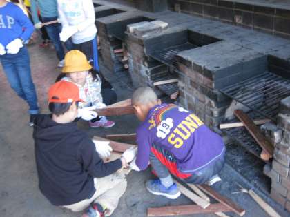 係りに分かれて、野外炊事の始まりです。薪組をする係りの子は、ちゃんと火がつくかどうか心配のようです。